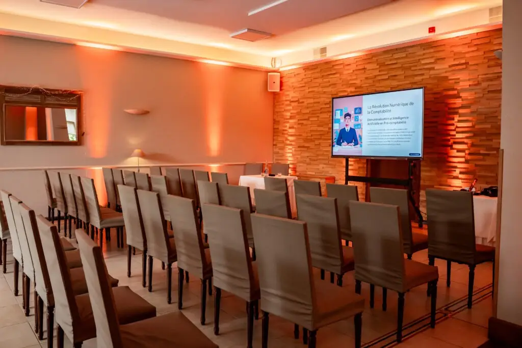 Nous offrons également une gamme complète d’équipements audiovisuels sur demande, configurables selon vos nécessités techniques spécifiques. De plus, un vaste parking est disponible pour accueillir tous vos invités en toute commodité.